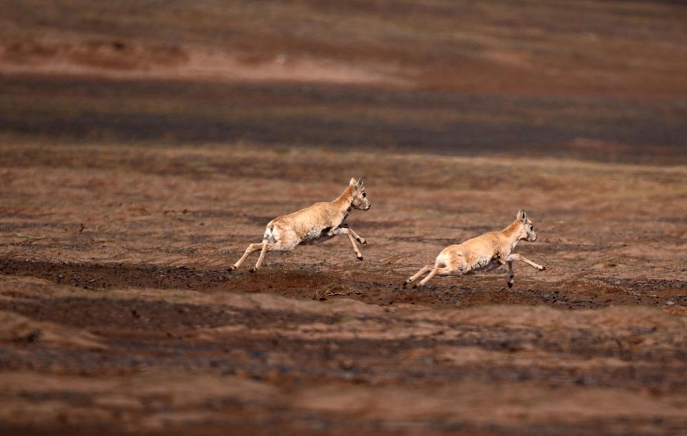 两只藏羚羊在可可西里卓乃湖区域活动(6月17日摄)。 新华社记者 张宏祥 摄
