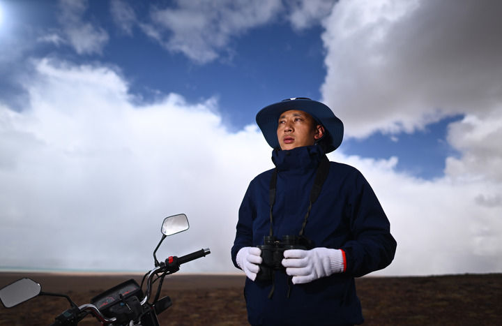 可可西里管理处卓乃湖保护站巡山队员尕玛扎西在巡山途中(6月17日摄)。新华社记者 张宏祥 摄