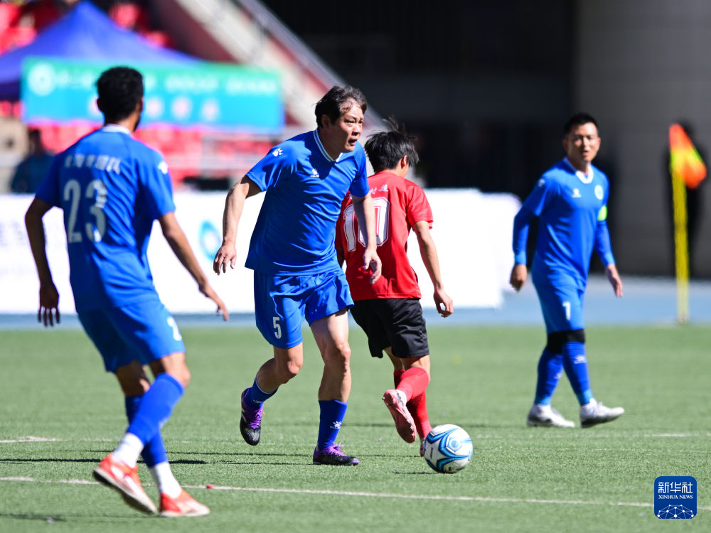 5月10日,代表青海青超联队出战的足球名宿范志毅(左二)在比赛中传球。新华社记者 张龙 摄