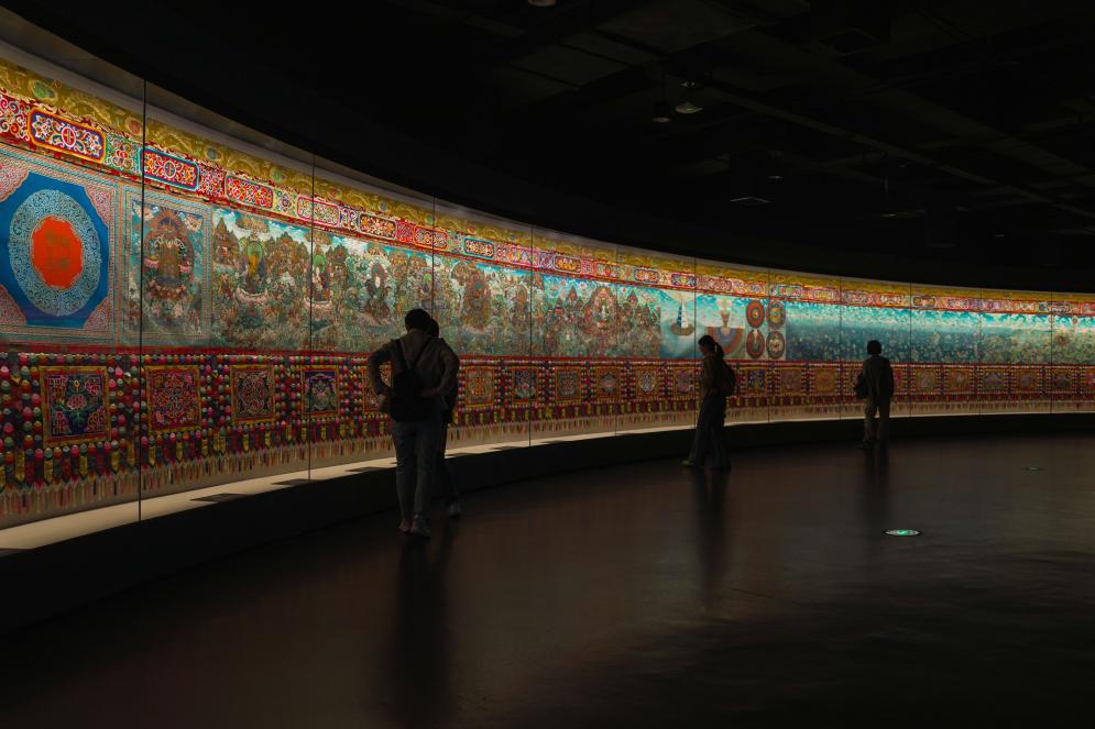 沿着展厅缓缓前行,最令人震撼的莫过于《中国藏族文化艺术彩绘大观》。讲解员温得兄停在一幅描绘神话传说的画面前介绍:“这幅作品由青、藏、甘、川、滇五省区400位唐卡画师共同完成,仅上卷创作就历时27年。”今年4月,全长410米的彩绘大观下卷布展完成,目前正在博物馆北馆特展展出。