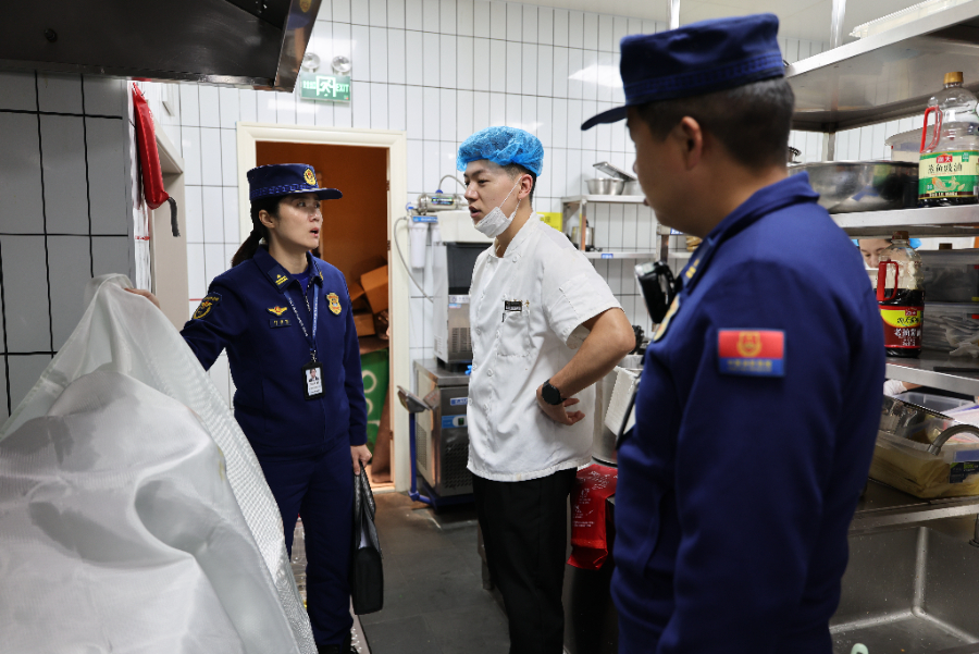 随后,刘海燕转向商场内部,逐项排查重点区域。“元旦期间人流量大,消防安全必须跑在风险前面。”她一边检查一边说,“我们重点围绕‘生命系统’展开‘体检’:一是查‘管理’检查单位是否真正落实了消防安全主体责任,消防管理制度是挂在墙上,还是落到行动上。只有管理这根‘主心骨’立住了,人防、物防、技防才能真正发挥作用;二是查‘通道’,疏散通道、安全出口必须保持畅通,防火卷帘下方严禁堆放货物,确保火灾时能正常降落分隔;三是查‘设施’,火灾报警是否灵敏、喷淋有无水源、灭火器是否完好,这些都关乎初期火灾扑救成效;四是查‘火源’,尤其是餐饮区,用火用电用气集中,油烟管道清洗、液化气瓶管理等细节必须严格到位。”