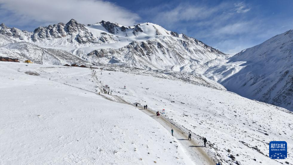1月1日,登山爱好者在攀登岗什卡雪峰(无人机照片)。新华社记者 齐芷玥 摄