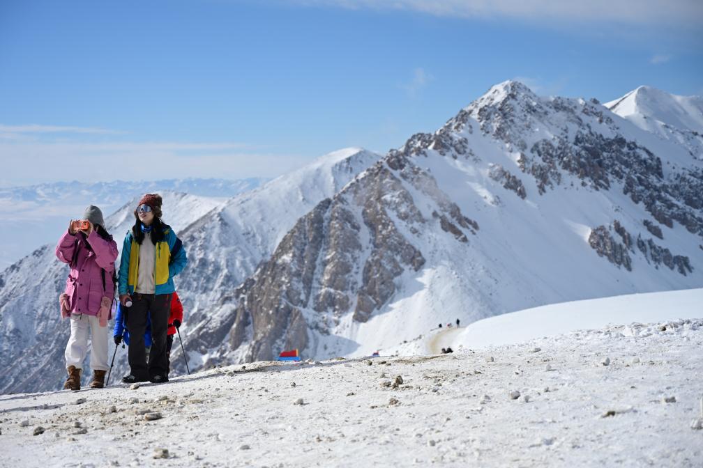 当日,在青海省海北藏族自治州门源回族自治县,登山爱好者们攀登岗什卡雪峰,在山巅与雪原间度过新年第一天。