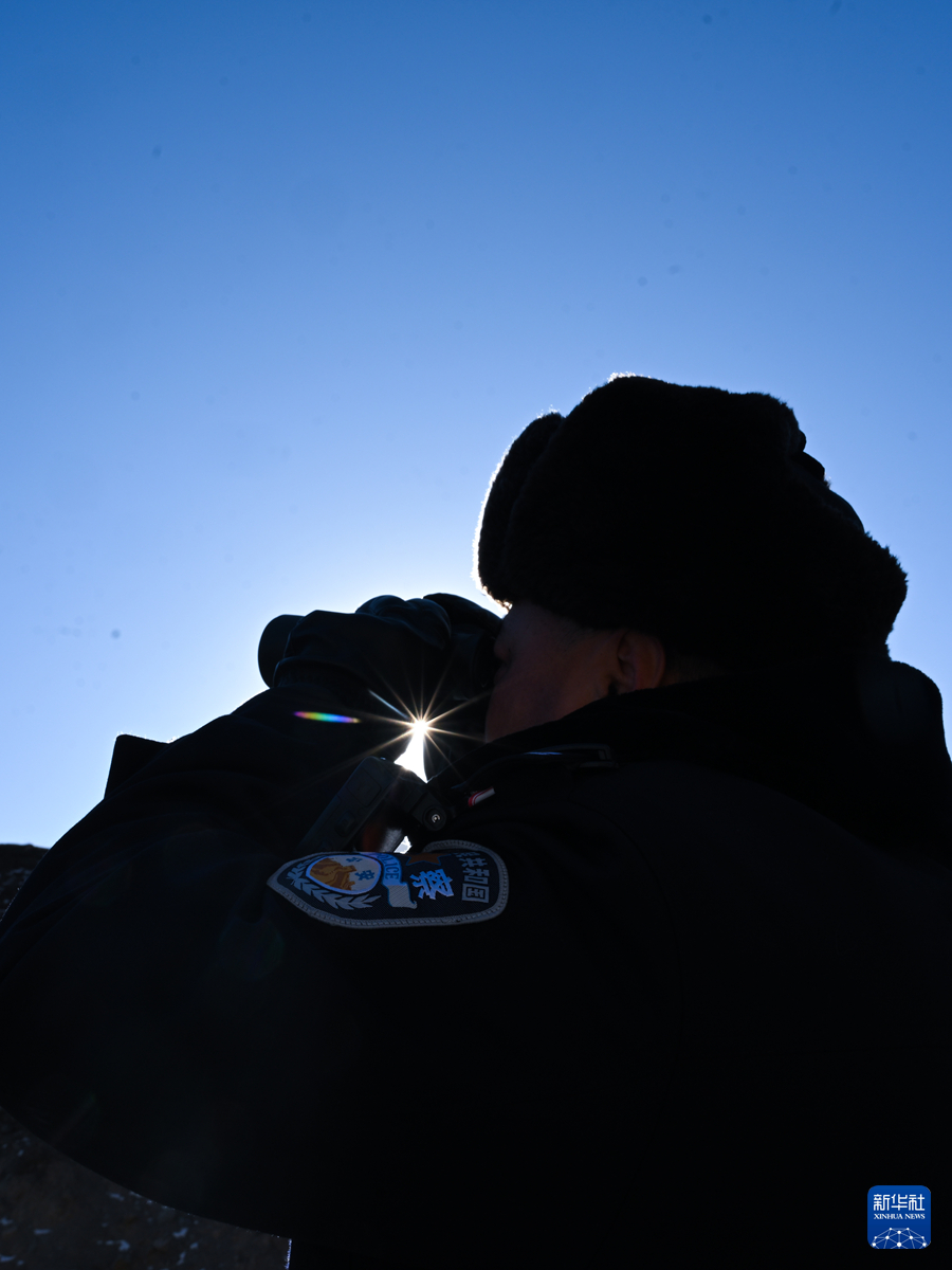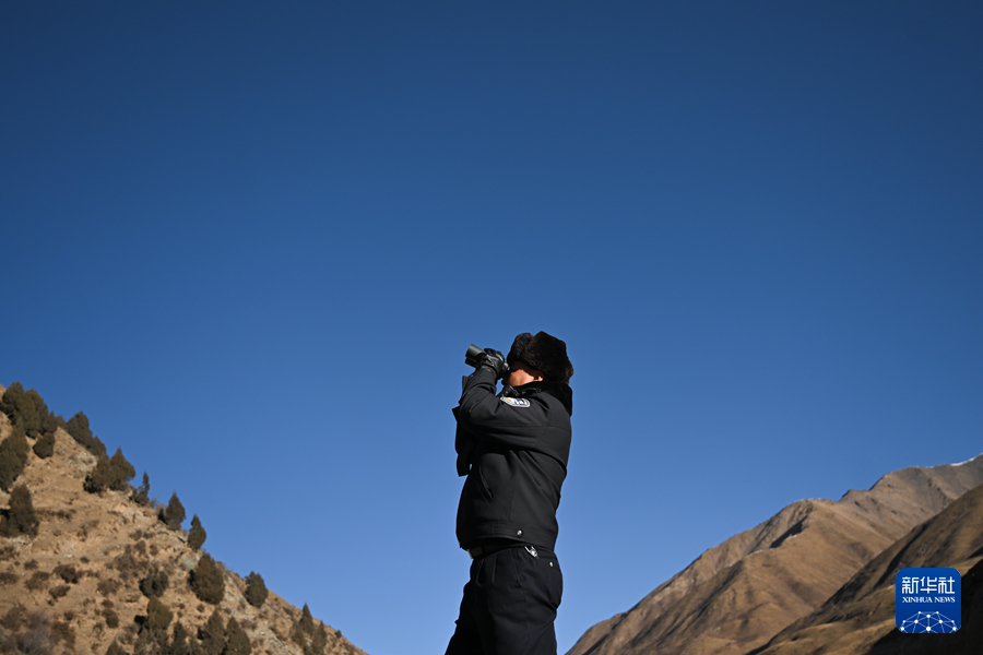 1月9日,在青海省海北藏族自治州门源回族自治县境内的老虎沟,民警郭建业在用望远镜查看远处。新华社记者 张龙 摄