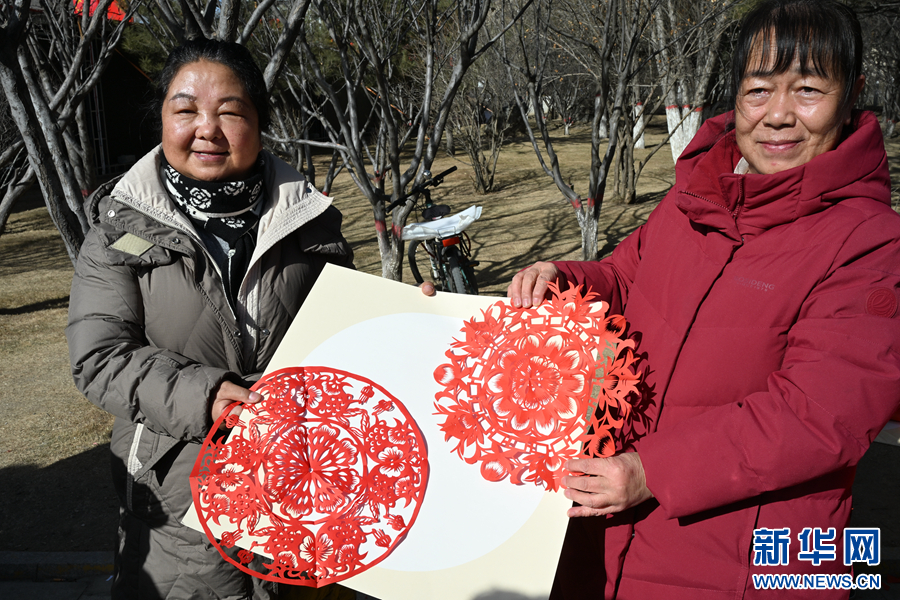 1月14日,青海西宁,两位市民在活动现场展示剪纸作品。