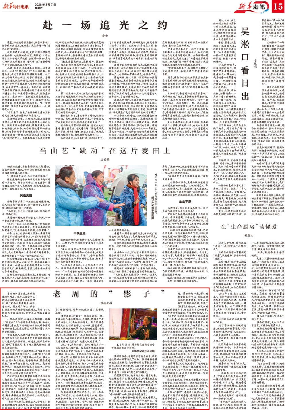 演出结束,天已经黑透了。老周蹲在台上收拾皮影,不时搓一搓冻僵的双手。“天冷不算啥,今年大年初一到正月十五,天天都排着戏,全是周边村里约的。有戏唱,就是最高兴的事。”