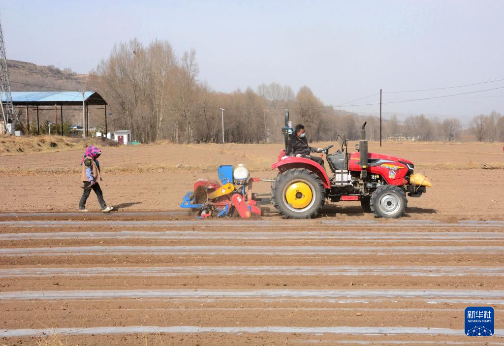 3月23日,青海省海东市民和回族土族自治县古鄯镇夏家河村村民正驾驶农机进行土地覆膜作业。新华社记者 王浡 摄