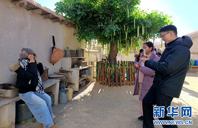 游客在柯鲁柯镇沉浸式影视文旅基地内参观体验。新华网发(蔡得军 摄)