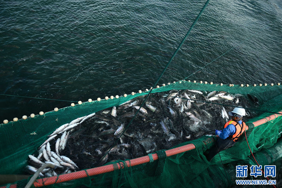 2024年10月18日,龙洋知鲜(青海)股份有限公司员工给冷水鱼降温。(新华社记者 张龙 摄)