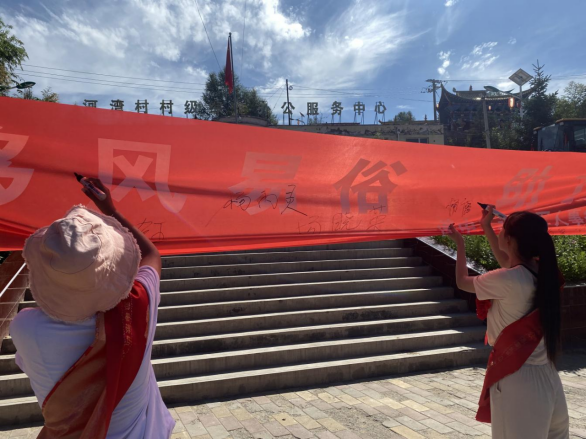 活动现场,12名准大学生们在“推进移风易俗 助力乡村振兴”横幅上郑重签下姓名,活动单位代表为他们佩戴大红花并发放“升学大礼包”,让学子们享受到“金榜题名”时的荣誉感和仪式感。同时,湟中区文化馆李家山分馆云谷艺苑演唱队的文艺志愿者们为河湾村的村民们献上了精心准备的文艺大餐。