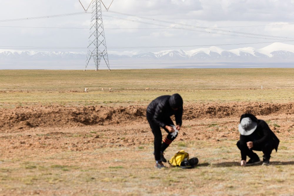 6月15日,中国科学院西北高原生物研究所研究员连新明(右)和他的学生王东在可可西里采集藏羚羊新鲜粪便样本。
