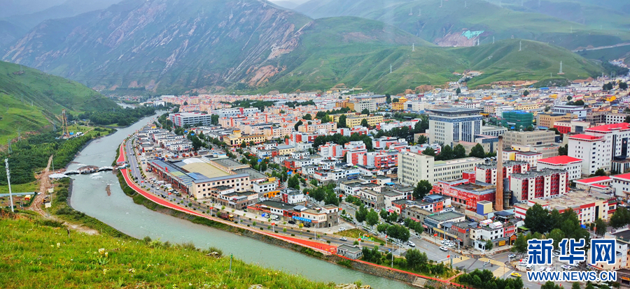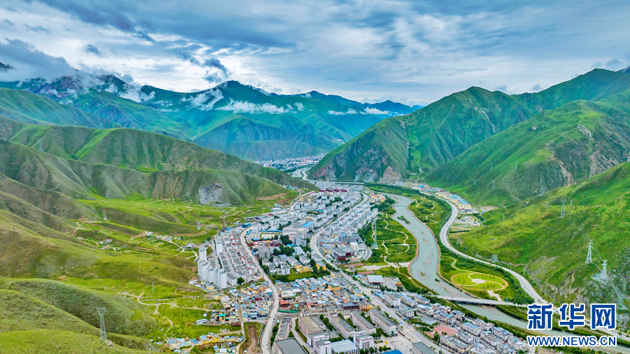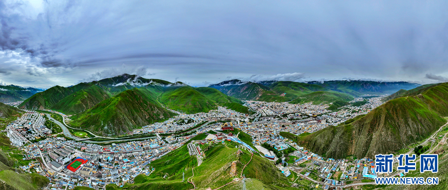 图为青海省玉树藏族自治州玉树市的夏日风光(无人机全景照片)。新华网发(宋忠勇 摄)