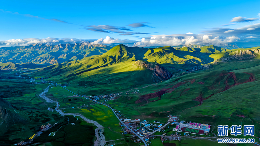 时值盛夏,青海省玉树藏族自治州景色怡人,群山和草原在蓝天白云的映衬下构成壮美的画卷。