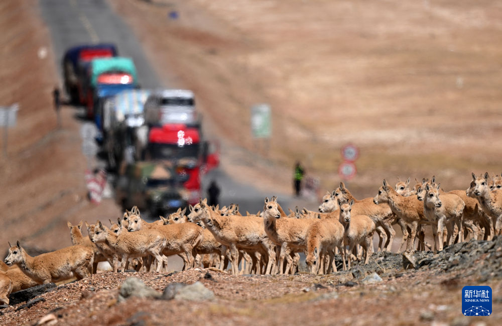 2023年5月29日,一群待产雌性藏羚羊正在通过青藏公路前往可可西里卓乃湖产仔。新华社记者张宏祥 摄