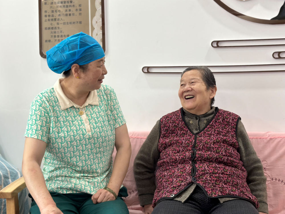 10月18日,在城西区公园巷社区 “爱老幸福驿站”,护理员赵明柳和陈荣改老人聊天。新华社记者张子琪 摄