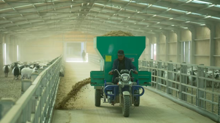 中午时分,工作人员将饲料放到搅拌机内,待饲料搅拌均匀后通过传送带运送到电动饲料投喂机中。随后,工作人员驾驶着投喂机缓缓进入畜棚,将饲料投入食槽,一只只羊儿探出小脑袋享用美食。