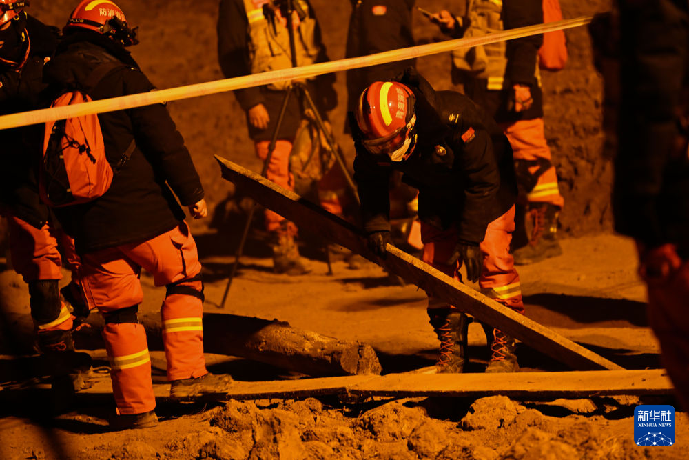 12月19日晚,救援人员在青海省海东市民和回族土族自治县中川乡金田村开展救援工作。新华社记者 张龙 摄