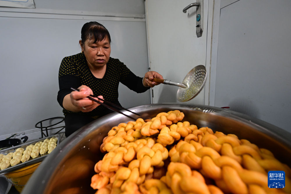 2月2日,在青海省海东市民和回族土族自治县官亭镇鲍家村安置点,村民喇英录花在炸馍。新华社记者 张龙 摄