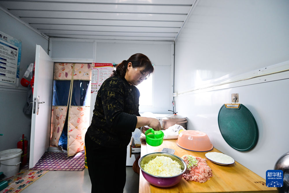 2月2日,在青海省海东市民和回族土族自治县官亭镇鲍家村安置点,村民鄂有萍在准备饺子馅。新华社记者 柳泽兴 摄