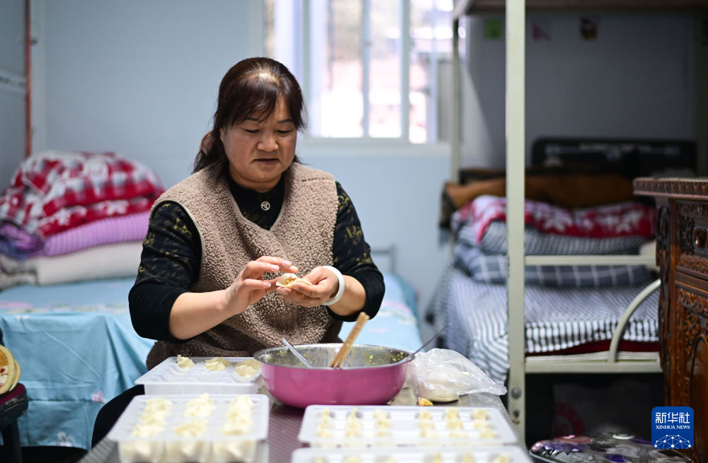 2月2日,在青海省海东市民和回族土族自治县官亭镇鲍家村安置点,村民鄂有萍在包饺子。新华社记者 张龙 摄