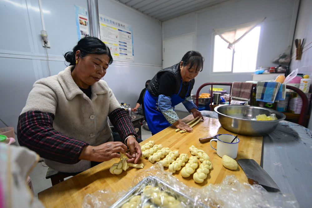 2月2日,在青海省海东市民和回族土族自治县官亭镇鲍家村安置点,村民在制作面食。新华社记者 柳泽兴 摄