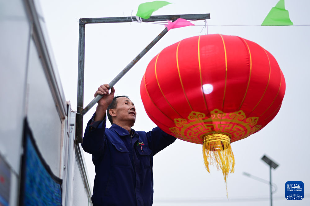 2月2日,在青海省海东市民和回族土族自治县官亭镇鲍家村安置点,村民鲍总西在挂灯笼。新华社记者 张龙 摄