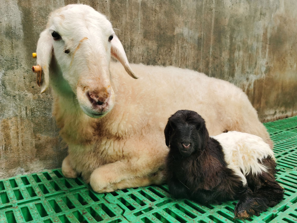 图为受体代孕“妈妈”和体细胞克隆羊羔(右)。(受访者供图)