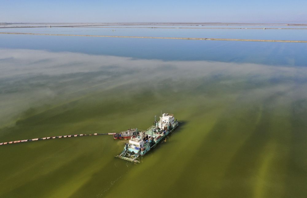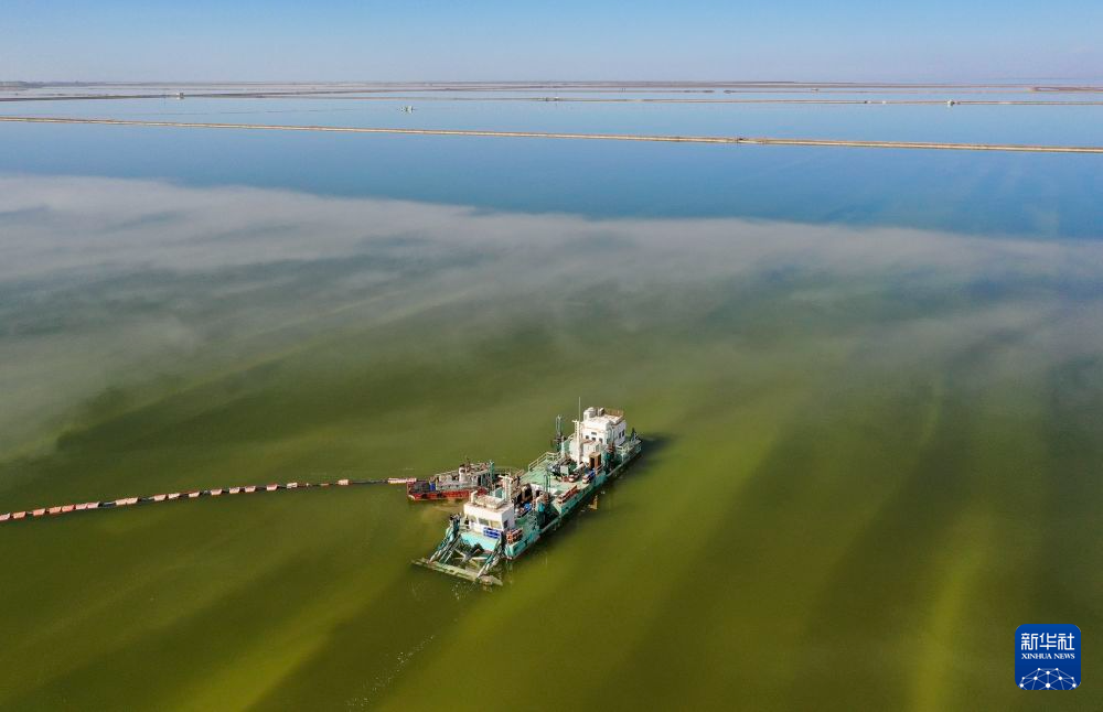 2023年2月2日,水采船在察尔汗盐湖中作业。新华社记者 张宏祥 摄