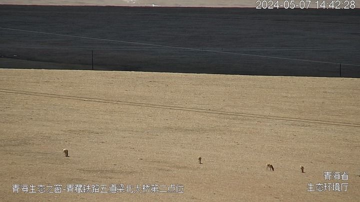 2024年5月7日14时30分许,通过“青海生态之窗”观测可可西里五道梁区域,发现藏羚羊通过青藏铁路五道梁北大桥。(卡娅梅朵摄)