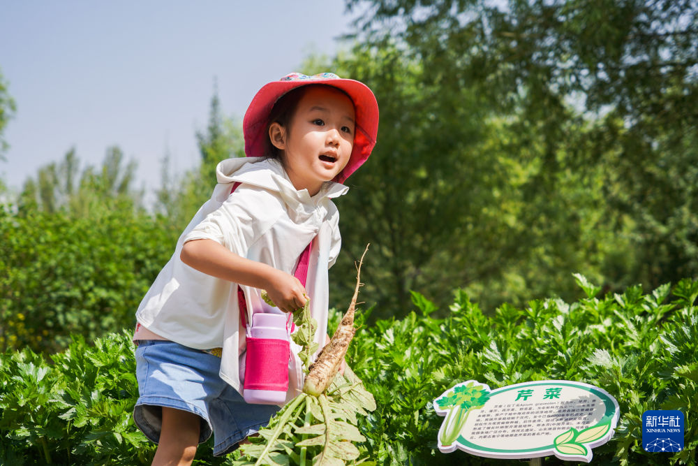 7月25日,小朋友在青海省西宁植物园举办的一场亲近自然的亲子活动上体验采摘。新华社记者 王艳 摄