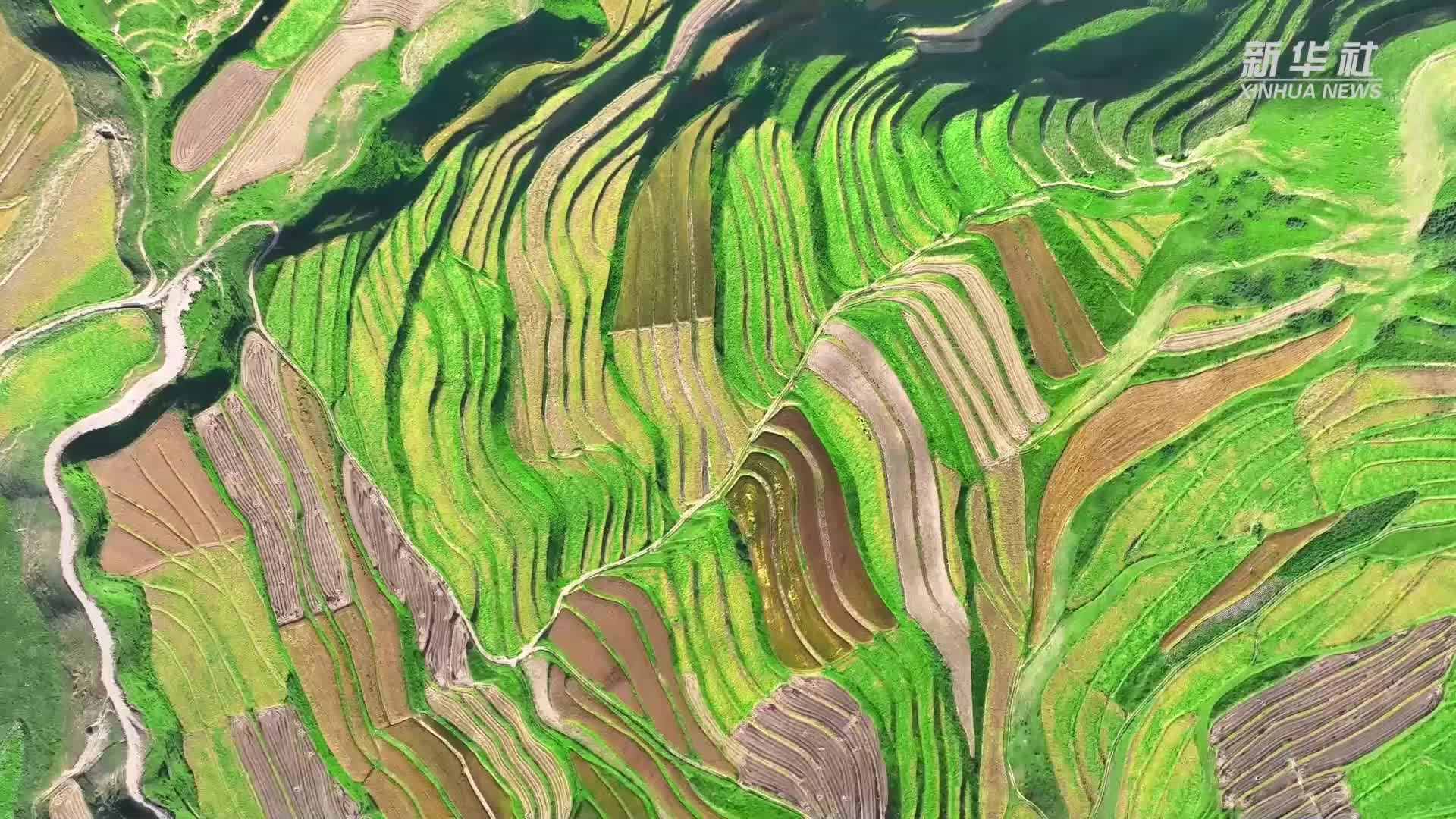 初秋时节,在青海省海东市化隆回族自治县,田野里的青稞、小麦、豌豆随风飘扬。梯田顺着山势起伏层叠铺展,乡间沃野如诗画田园。