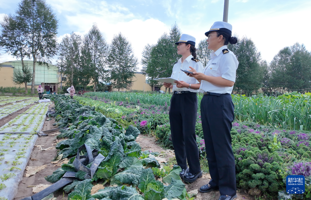 8月15日,西宁曹家堡机场海关监管科科长仁青措(右)和同事在互助县“供港澳蔬菜生产基地”核查蔬菜品种。新华社记者 王艳 摄