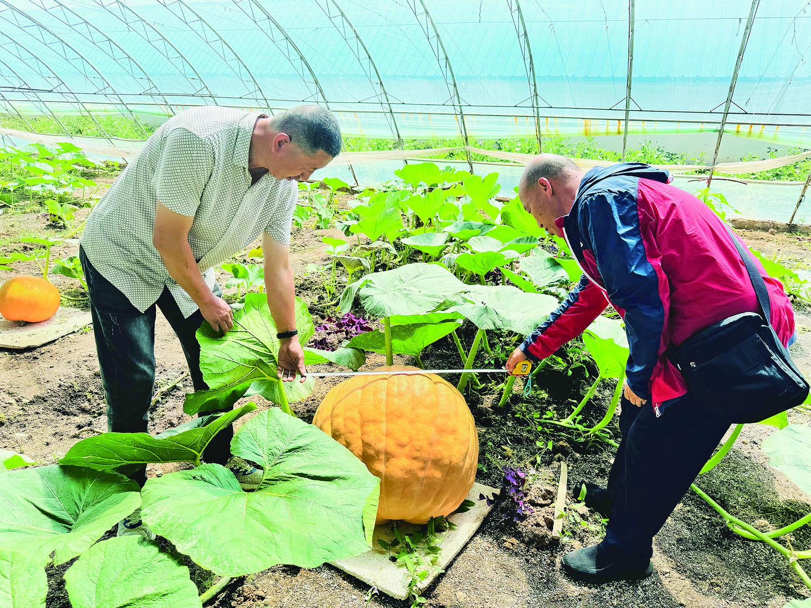 千紫缘两个太空南瓜种植大棚,近10个大南瓜,胡小朋和魏文龙挨个查看它们的长势、色泽、品相,每查完一个,便拿出卷尺测量大南瓜的直径和周长。“最大的南瓜直径达到70厘米,小一点的直径也有58厘米了。今年的南瓜差不多长到140多斤,等大南瓜再成熟一些,就可以搬出去向大家展示了。”