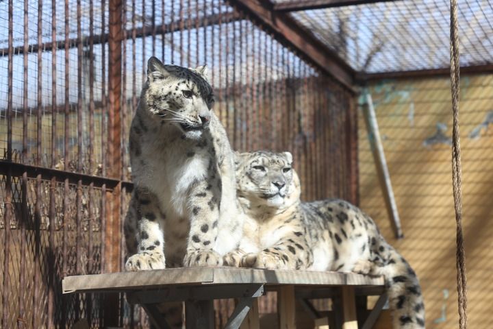 2023年3月3日,在青海省西宁市西宁野生动物园,雪豹“大虎”和“凌霜”正在休憩。新华社记者 李宁 摄