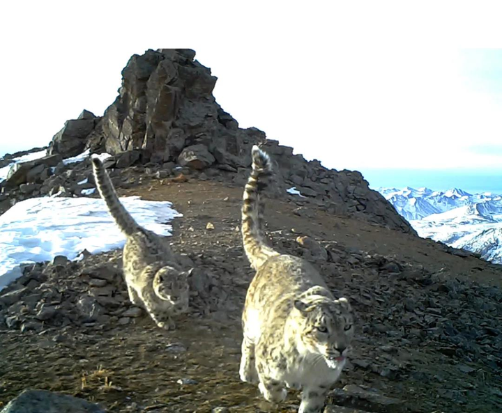 2021年1月7日,在西宁市大通回族土族自治县的大通北川河源区国家级自然保护区的两只雪豹。(大通北川河源区国家级自然保护区管理局供图)