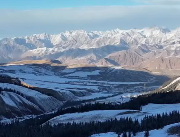 进入冬季,青海省海北藏族自治州祁连县境内景色壮丽,地处青藏高原北缘的祁连山展现出特有的美景,雪山、森林、牦牛、羊群与蓝天组成了一幅壮美的冬日画卷。