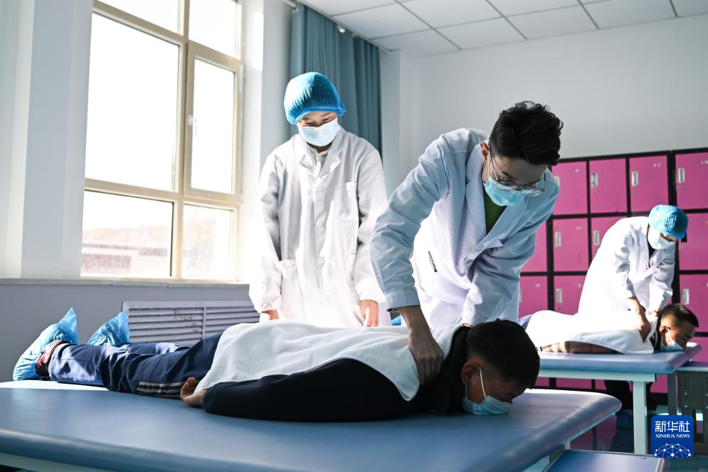 12月17日,青海省海南藏族自治州职业技术学校藏医药专业教师在指导学生学习推拿。新华社记者 央秀达珍 摄
