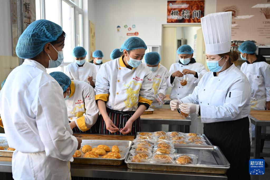 12月17日,青海省海南藏族自治州职业技术学校烹饪专业教师黄雪妍(前右)在指导学生学习西点烘焙。新华社记者 央秀达珍 摄