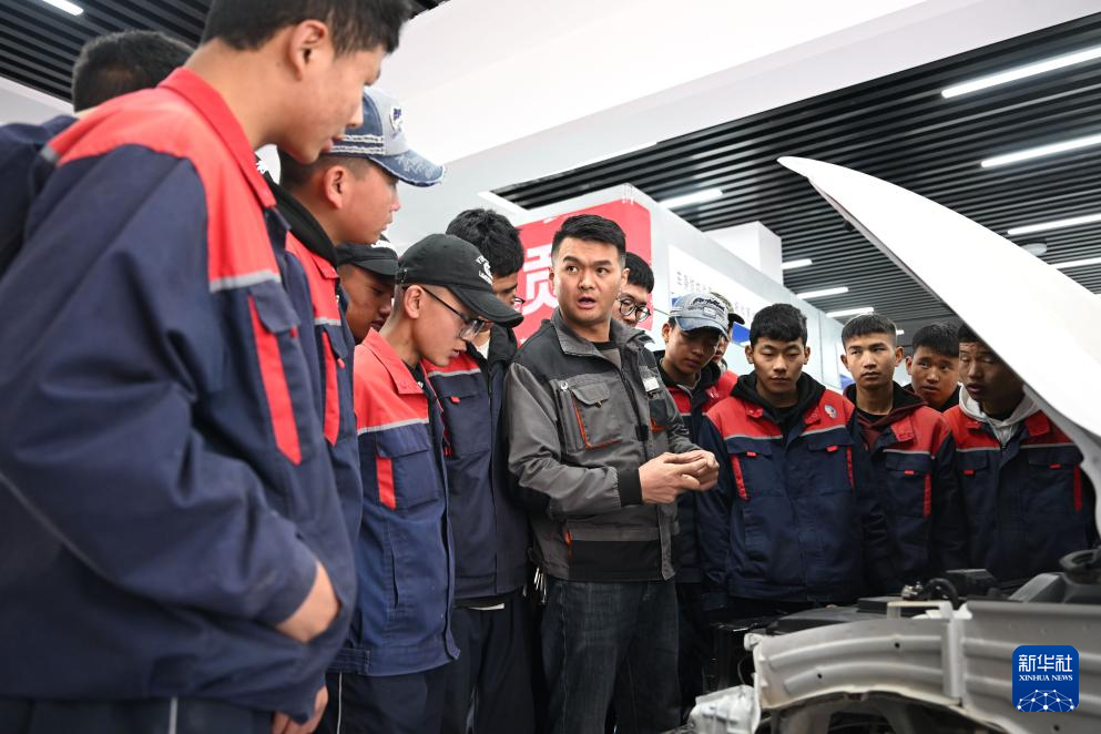 12月17日,青海省海南藏族自治州职业技术学校汽车维修专业教师张峰德(中)在指导学生进行实训。新华社记者 央秀达珍 摄