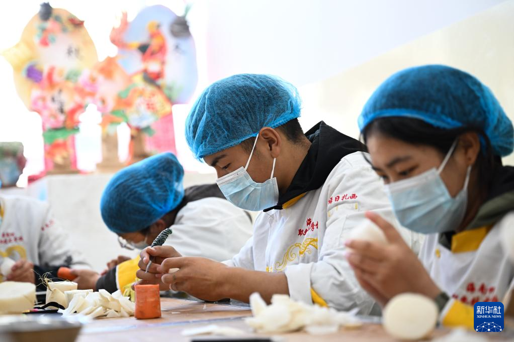 12月17日,青海省海南藏族自治州职业技术学校烹饪专业学生在练习食材雕刻。新华社记者 央秀达珍 摄