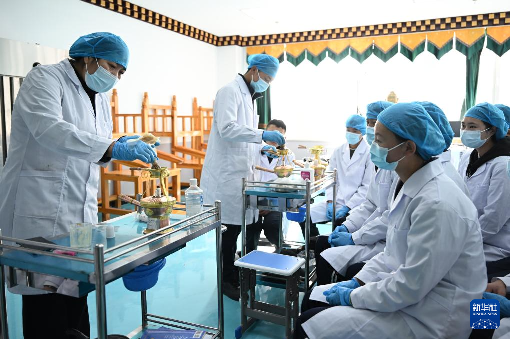 12月17日,青海省海南藏族自治州职业技术学校藏医药专业教师尕玛吉(左一)在指导学生学习藏医药传统疗法。新华社记者 央秀达珍 摄