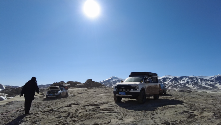 巡山队车辆在可可西里无人区腹地的布喀达坂峰山脚下发生陷车等待救援。(摄于2025年1月14日)