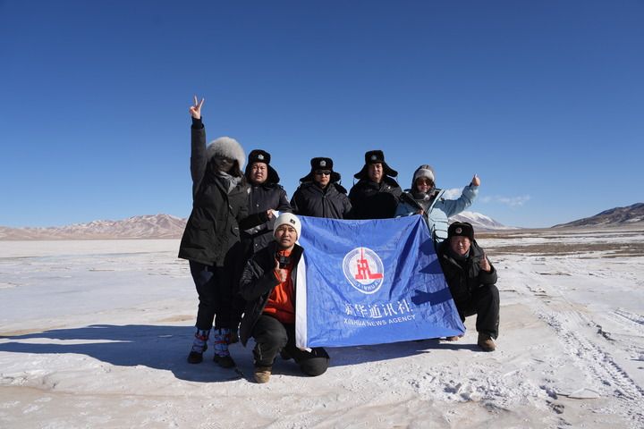 记者与巡山队员在可可西里无人区太阳湖附近合影。(摄于2025年1月14日)
