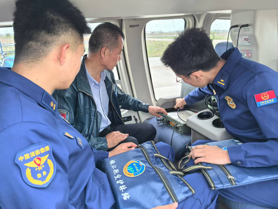 试飞前,机组人员给学员介绍机上的通讯装备。(国家消防救援局青海机动队伍供图)