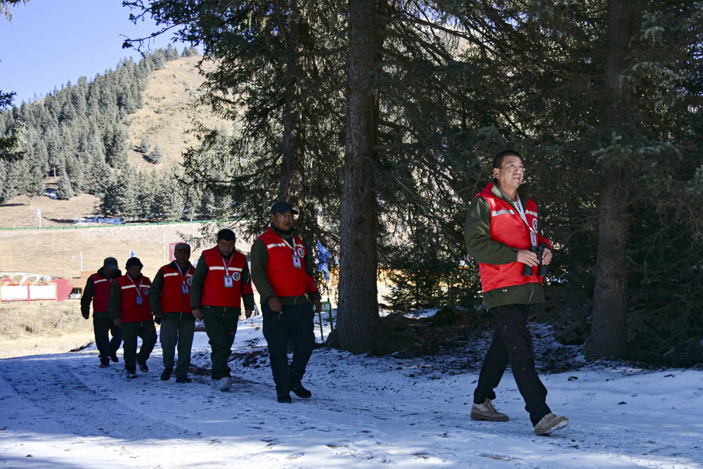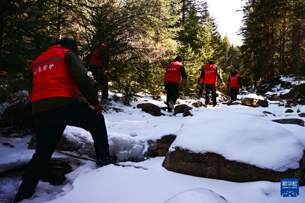 初冬时节,祁连山脉草木渐黄,风大物燥,火险等级较高。祁连县阿咪东索林区护林员踏雪巡山,排查火险隐患,强化火源管控,守护高原林海平安过冬。