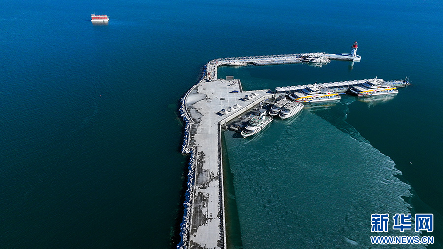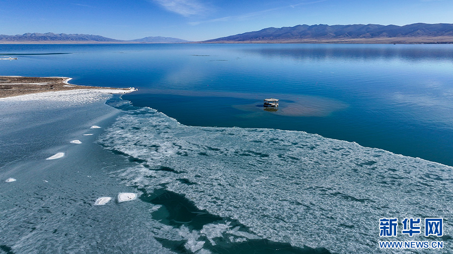 航拍青海湖半湖碎冰半湖水。新华网发(薛蒂 摄)