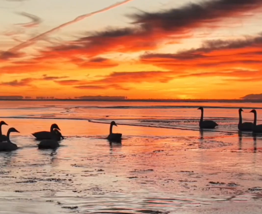 凛冬时节,在位于青海省的青海湖,夕阳给湖面铺上了一层“金箔”。越冬天鹅在此聚集,构成灵动绝美的冬日图景,仿佛是远道而来的生灵写给高原的“冬日情书”。