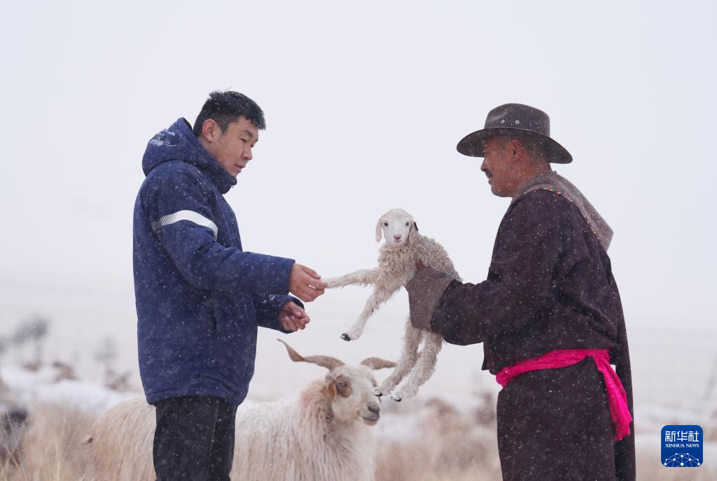 3月8日,在青海省海北藏族自治州祁连县阿柔乡草大板村,阿柔乡畜牧兽医站工作人员布银达拉(左)在查看东宝家转场来的羊羔。新华社记者 张龙 摄