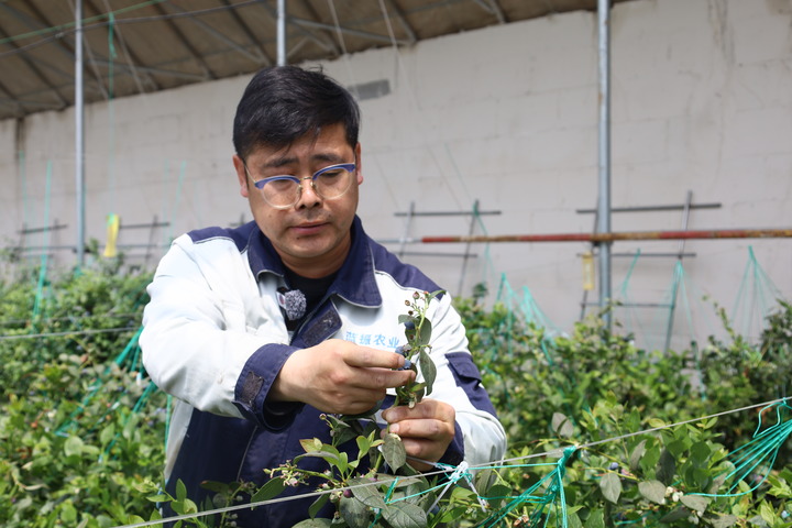 技术主管张晔在青海美一蓝振农业科技有限公司蓝莓种植基地大棚内查看蓝莓长势。新华社记者王浡 摄