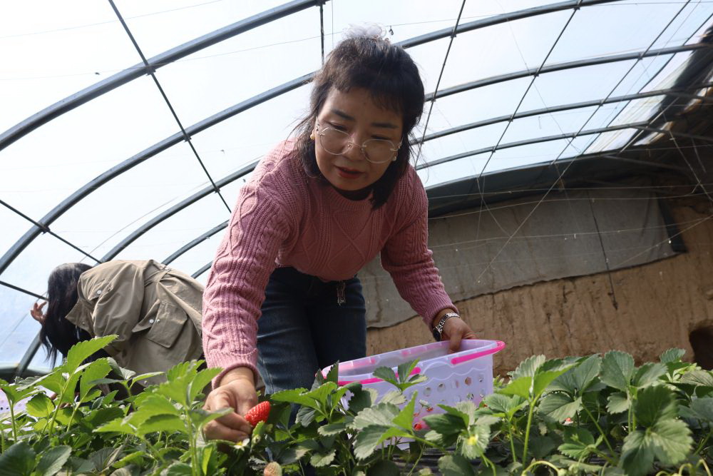 游客在民和县金星村农业产业示范园采摘草莓。新华社记者王浡 摄